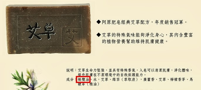 像阿原他最有名的艾草皂,成分擺明了基礎油只有橄欖油,缺乏椰子油。所以我會說這顆肥皂對於成天在外奔波的男性完全不適合,因為洗淨力不夠強。我確信他的廣告說的一點都沒錯,是淨化心靈用的。